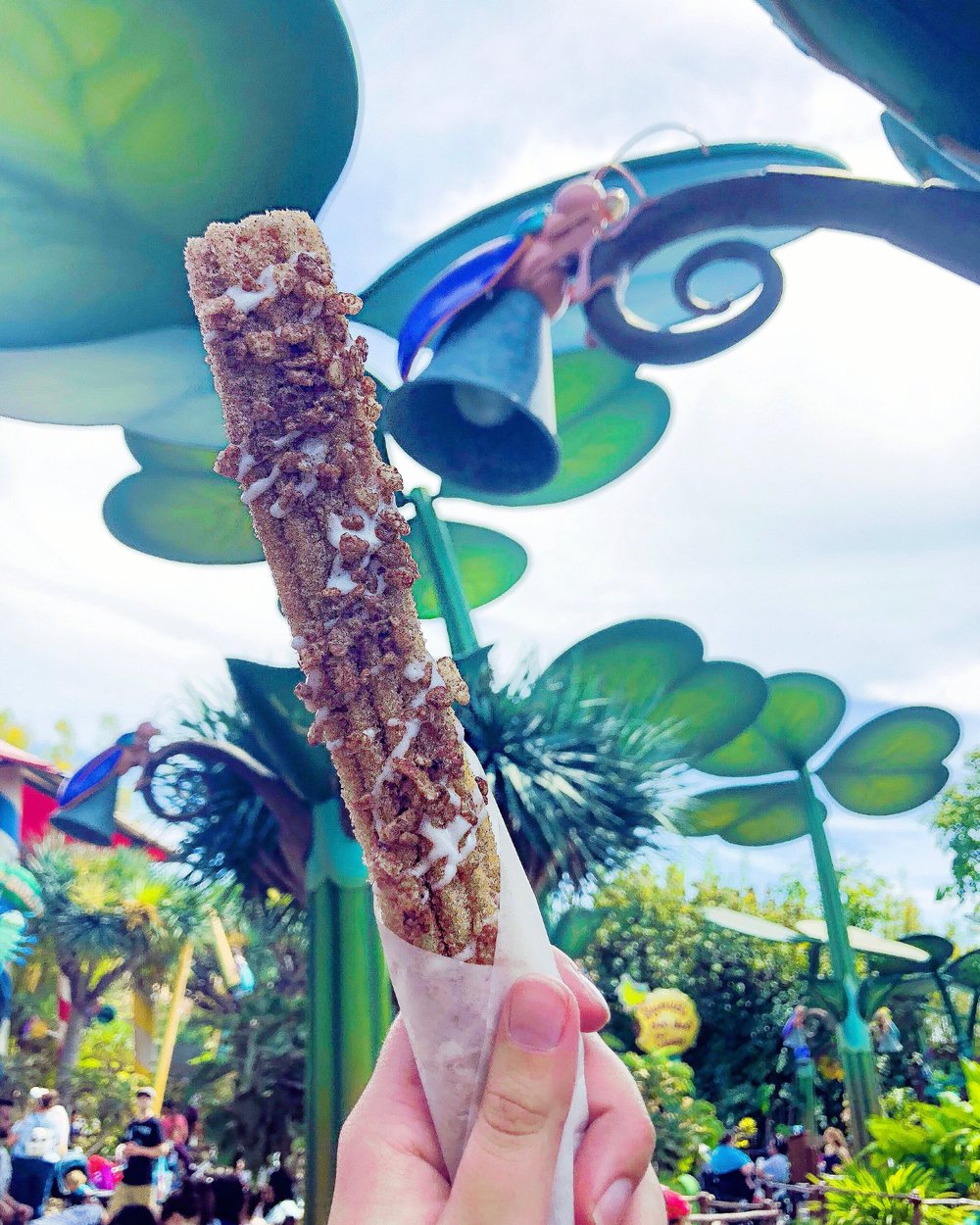 Although this is the most Instagramable churro, it is NOT the tastiest. The churro itself was softer and thicker than a normal churro with flavors consisting of cinnamon with a hint of vanilla frosting. Even though the churro is dusted with cocoa flavored cereal, no chocolate flavors can be found here. It surprisingly tastes like a normal churro. Compared to the other new specialty churros around during Pixar Fest, this churro was a flop.