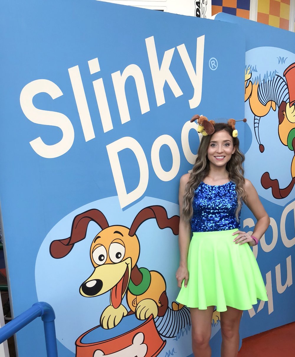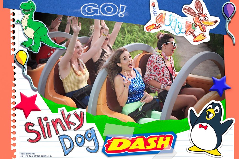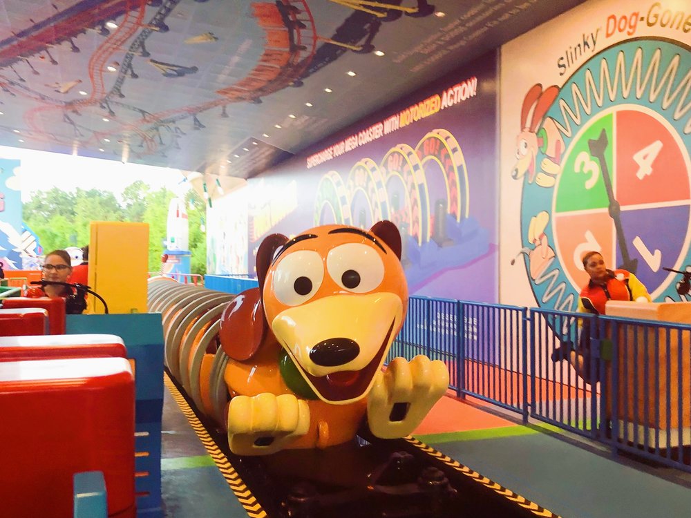 The Slinky Dog Dash roller coaster is clearly inspired by a Hot Wheels car track with Slinky Dog being the ride vehicle. This may be my FAVE coaster ever because of how incredibly smooth it is as well as the theming! This ride has some of your favorite Toy Story characters like a giant Jessie stringing up lights and Wheezy, the penguin, singing karaoke. This ride is fun for people of all ages!