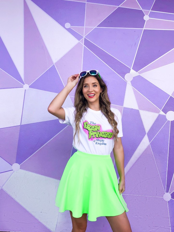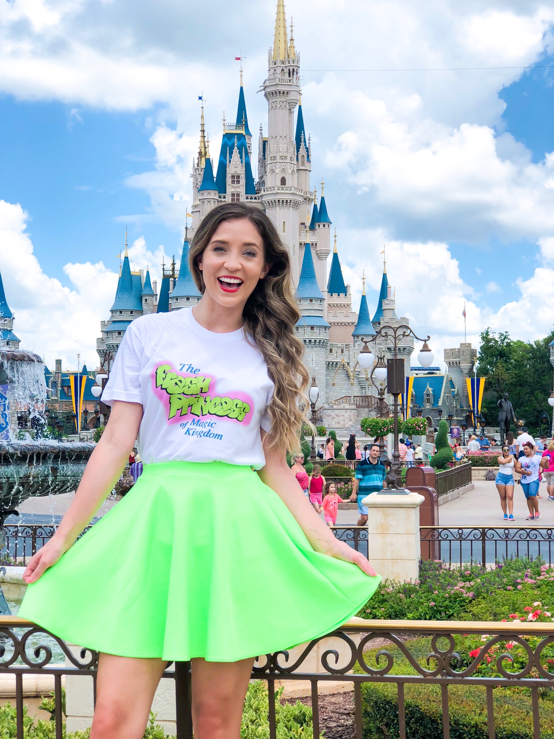 In West Philadelphia born and raised… I don’t know about you, but I LOVED the show The Fresh Prince of Bel-Air. I’m proud to say I’m one of those people who knows every word to the theme song! When I saw this “Fresh Princess of Magic Kingdom” shirt I freaked out!! I decided to pair the top with this cute, bright skirt to make the perfect neon outfit inspired by the 90’s. Let’s bring back ALL the neon colors please.