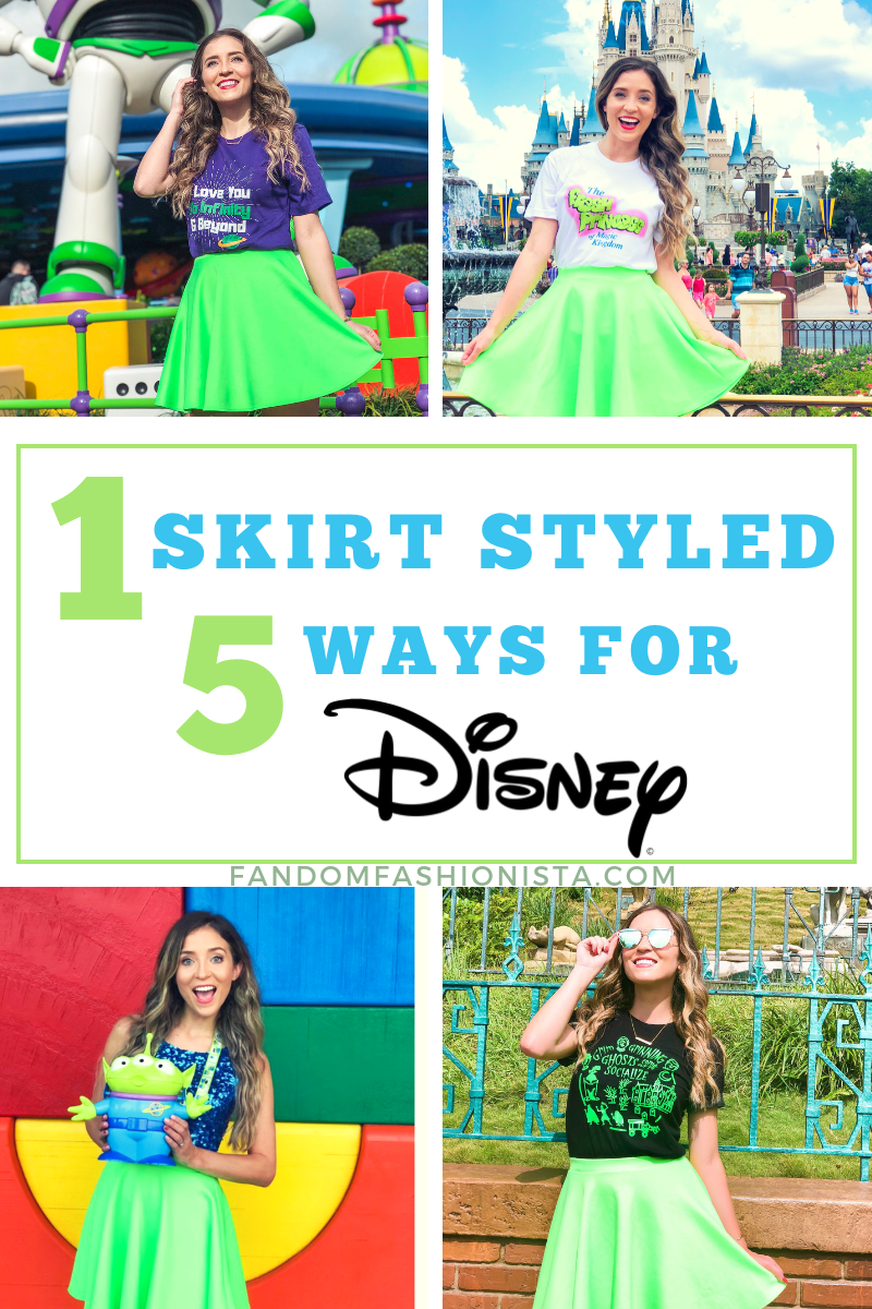 So today I wanted to share with you how I took one skirt and styled it five different ways. I love this Green Skater Skirt so much because it adds such a fun pop of color to any outfit! For only $15, it’s an affordable piece to have in your wardrobe to mix and match for different Disney outfits. So here are 5 ways to rock the skirt!