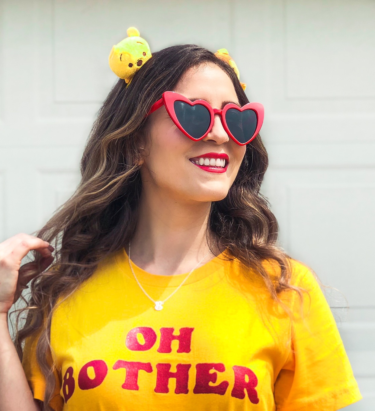 These red heart sunglasses add that glamorous touch to this Winnie the Pooh Disneybound outfit. Probably my favorite reason to incorporate sunglasses into Disney outfits is because depending on the lighting, sunglasses can end up saving the day when it comes to pictures. Let me explain… When you’re exploring either Disney World or Disneyland, most of the time it’s going to be bright and sunny. Which is great for weather but bad for pictures. The harsh lighting can cause awkward shadows on your face when trying to get those cute outfit pics for the gram. So I always recommend bringing a pair of cute sunnies that are way more flattering in direct sunlight. You can shop these red heart sunglasses for only $10 here.