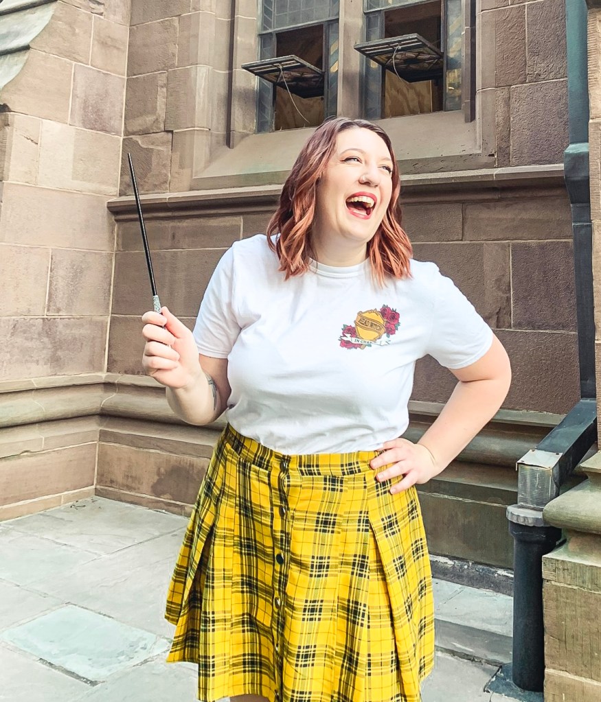 My friend Shawna not only looks adorable in this Hufflepuff House outfit, but she’s also the one who designed the Head Witch shirts that everyone is wearing! I love how her shirt is so perfectly paired with a bright yellow, plaid skirt to make the cutest Hogwarts House outfit! Be sure to check out her shop, Magically Styled, for more adorable Harry Potter shirts.