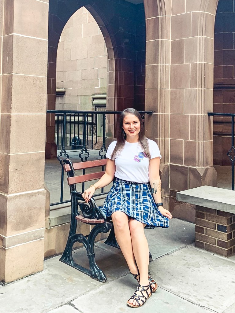 I definitely have to start with my own Hogwarts house… Slytherin pride for life!! I have always wanted to put together a Slytherin house uniform, and I’m so glad I finally did! I felt like a real life Hogwarts student (I mean I always have been but now I got to dress like it lol). I decided on this adorable Head Witch shirt in my Slytherin house colors. And of course no Hogwarts school uniform would be complete without a plaid skirt. This Hogwarts House outfit is perfect for anyone wanting to show off their wizarding style or for a trip to the Wizarding World of Harry Potter!