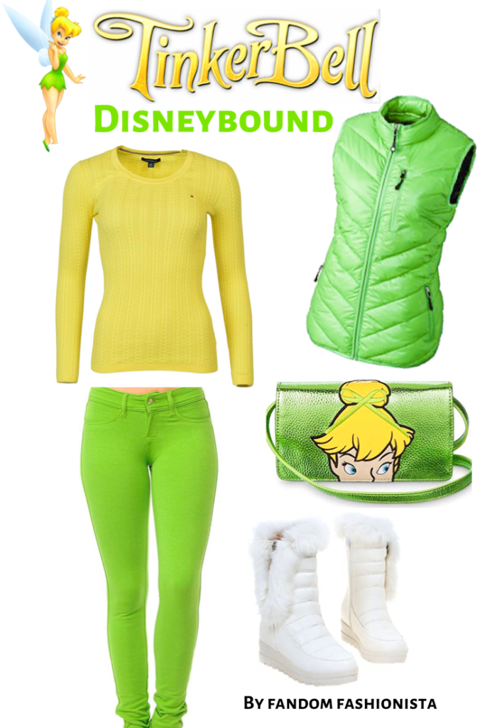 All you need is faith, trust, pixie dust, and this adorable Tinker Bell Disneybound outfit! I’ve always been a huge fan of Tinker Bell’s signature lime green outfit so I was sure to incorporate it into this Winter Disneybound. These lime green jeggings and matching puffer vest add that perfect pop of color. I’ve also styled the outfit with white boots and a cute crossbody bag. Tinker Bell herself would def approve of this Winter Disneybound!