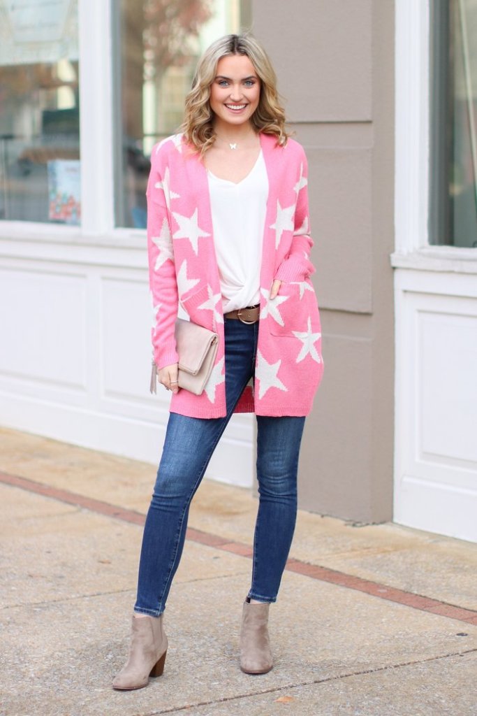 I am beyond obsessed with this pink star cardigan! First of all I love the bright pink color, especially for a Valentine’s Day outfit. But this makes for a great everyday outfit as well by styling it with a basic white or black tee.