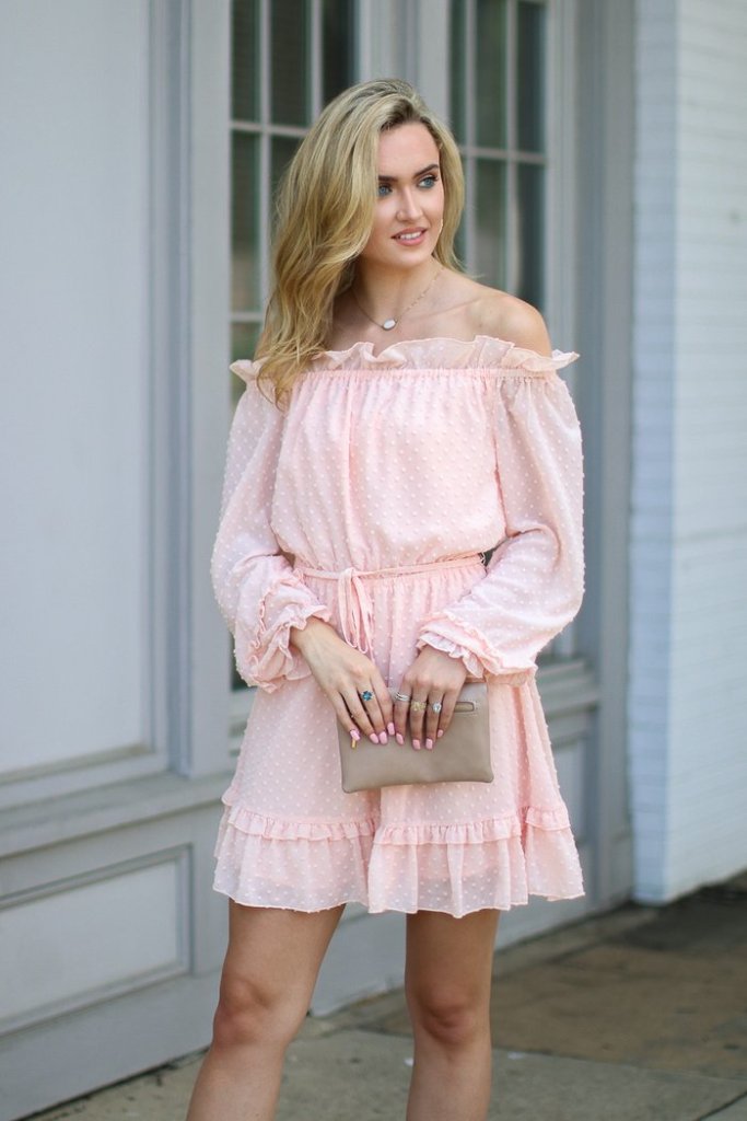 How gorgeous is this light pink off the shoulder dress?! I love the subtle polka dots that are incorporated into the pattern. I always prefer to purchase items that I know I can wear multiple times, and this dress is great for so many more occasions that just Valentine’s Day.