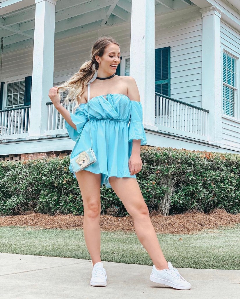 I absolutely love this Cinderella Disneybound Outfit! Not only is it perfect for a Cinderella look, but this baby blue romper is a cute piece to have in any closet. The best part is that it’s only $20. I paired it with a black necklace and purse for the ultimate Cinderella look!
