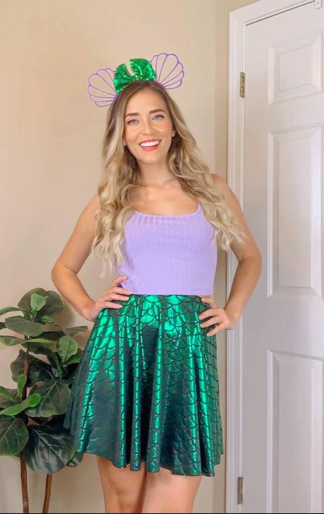Growing up, my favorite Disney princess was Ariel. So I had to put together a Little Mermaid Disneybound Outfit. I paired this purple tank top with a mermaid skirt and seashell Disney ears. Another plus of wearing this Ariel Disney outfit is that they have so many cute photo spots at the Little Mermaid ride in Magic Kingdom!